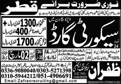Latest Security jobs and others Overseas jobs in Zafran Recruiting Agency closing date is around March 2, 2023, see exact from ad.