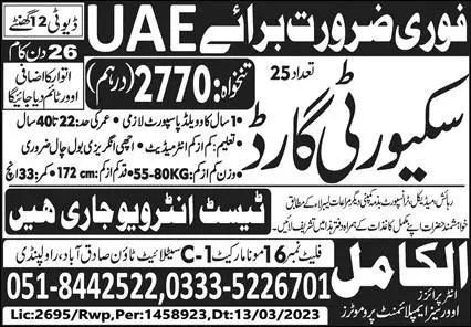 Security Guard Jobs in UAE 2023 announce the Contract career opportunities for the post of See Below Ad in United Arab Emirates for the fresh and experienced candidates on Contract basis who have Check Advertisement degree. Posted date of this post is 16/03/2023 and the last date is 30/03/2023. if you are eligible for this job apply before due date.
