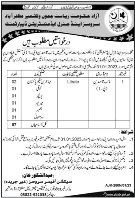 - Services & General Administration Department Muzaffarabad, muzaffarabad AJK Pakistan invites applications from eligible candidates for the post of naib qasid as per advertisement of January 17, 2023 published in daily Ausaf Newspaper. Persons with Primary, Matric and Middle etc. education can apply.