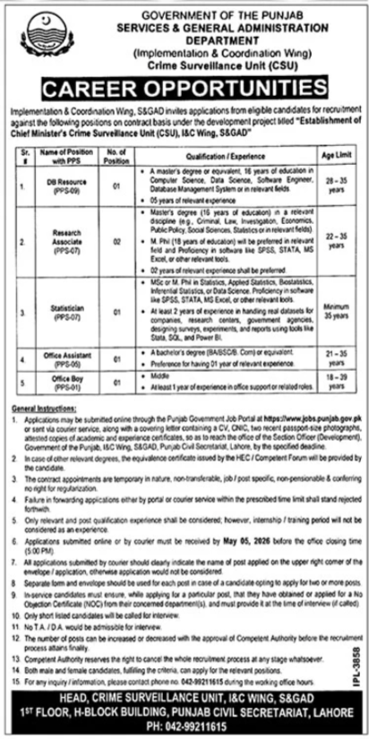 Implementation & Coordination Wing, S&GAD invites applications from eligible candidates for recruitment against the following positions on contract basis under the development project titled "Establishment of Chief Minister's Crime Surveillance Unit (CSU), I&C Wing, S&GAD".