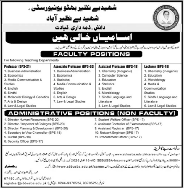 Shaheed Benazir Bhutto University Nawabshah Jobs 2026 announce the Contract career opportunities for the post of See Below Ad in Sindh for the fresh and experienced candidates on Contract basis who have Check Advertisement degree. Posted date of this post is 04/01/2026 and the last date is 16/01/2026. if you are eligible for this job apply before due date.