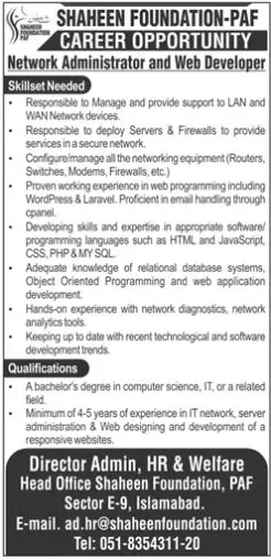- Vacant posts including network administrator web developer are announced in Shaheen Foundation PAF Islamabad, islamabad Islamabad Pakistan as per 12 February 2023 advertisement in daily Jang Newspaper. Persons with MS, Bachelor and Master etc. education can apply.