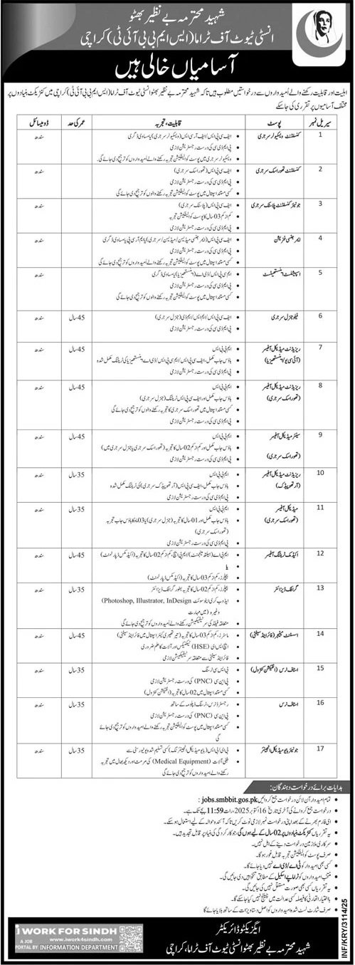 Shaheed Mohtama Benazir Bhutto Institute of Trama Jobs 2025 announce the Contract career opportunities for the post of See Below Ad in Sindh, Karachi for the fresh and experienced candidates on Contract basis who have Check Advertisement degree. Posted date of this post is 05/10/2025 and the last date is 16/10/2025. if you are eligible for this job apply before due date.