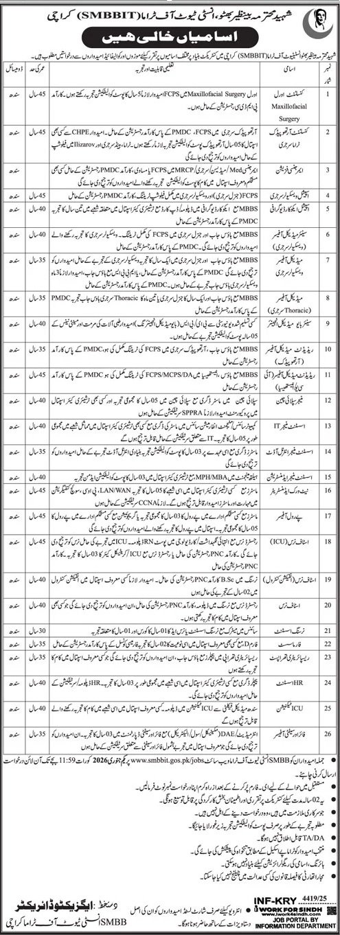 Shaheed Mohtarma Benazir Bhutto Institute Trauma Jobs 2026 announce the Contract career opportunities for the post of See Below Ad in Sindh, Karachi for the fresh and experienced candidates on Contract basis who have Check Advertisement degree. Posted date of this post is 21/12/2025 and the last date is 01/01/2026. if you are eligible for this job apply before due date.