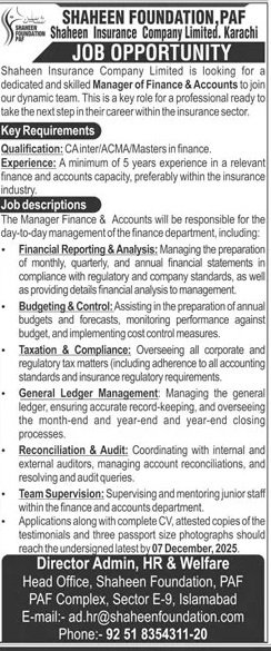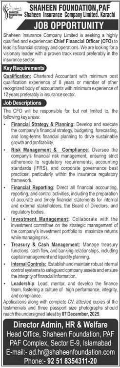 Shaheen Foundation PAF Karachi Job 2025 announce the Contract career opportunities for the post of See Below Ad in Sindh, Karachi for the fresh and experienced candidates on Contract basis who have Check Advertisement degree. Posted date of this post is 30/11/2025 and the last date is 07/12/2025. if you are eligible for this job apply before due date.