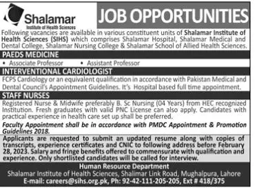 - Shalamar Institute of Health Sciences jobs advertisement dated about 19 February 2023 in daily Jang Newspaper invites application for the vacant post of associate professor, staff nurses, assistant professor paeds medicine, associate professor paeds medicine, assistant professor and interventional cardiologist in Lahore, lahore Punjab Pakistan. MBBS and Others etc. educational qualification will be preferred.