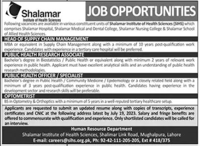 - Vacant posts including public health officer, head of supply chain management, optometrist, public health research associate and specialist are announced in Shalamar Institute of Health Sciences Lahore, lahore Punjab Pakistan as per 9 July 2023 advertisement in daily Jang Newspaper. Candidates with MBBS, Master and Bachelor etc. educational background will be preferred.