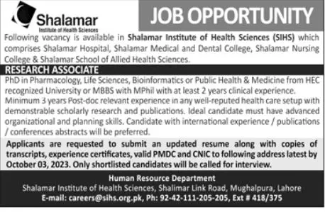 Shalamar Institute of Health Sciences Lahore, lahore Punjab Pakistan invites applications from eligible candidates for the post of research associate as per advertisement of September 24, 2023 published in daily Jang Newspaper.