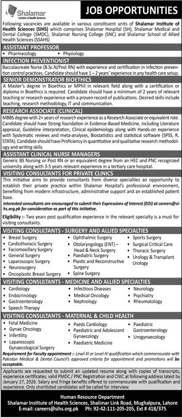 Shalamar Institute of Health Sciences Jobs 2026