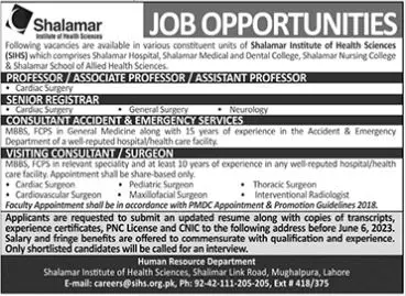 - Vacant posts including professor, visiting consultant, associate professor, consultant accident emergency services, registrar, visiting surgeon and assistant professor are announced in Shalamar Institute of Health Sciences Lahore, lahore Punjab Pakistan as per 28 May 2023 advertisement in daily Jang Newspaper. Candidates with Others and MBBS etc. educational background will be preferred.