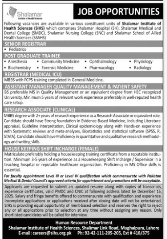 Shalamar Institute of Health Sciences lahore Jobs 2025 announce the Contract career opportunities for the post of See Below Ad in Punjab, Lahore for the fresh and experienced candidates on Contract basis who have Check Advertisement degree. Posted date of this post is 07/12/2025 and the last date is 22/12/2025. if you are eligible for this job apply before due date.