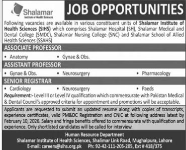 Shalamar Institute of Health Sciences Lahore Jobs 2026 announce the Contract career opportunities for the post of See Below Ad in Punjab, Lahore for the fresh and experienced candidates on Contract basis who have Check Advertisement degree. Posted date of this post is 01/02/2026 and the last date is 10/02/2026. if you are eligible for this job apply before due date.