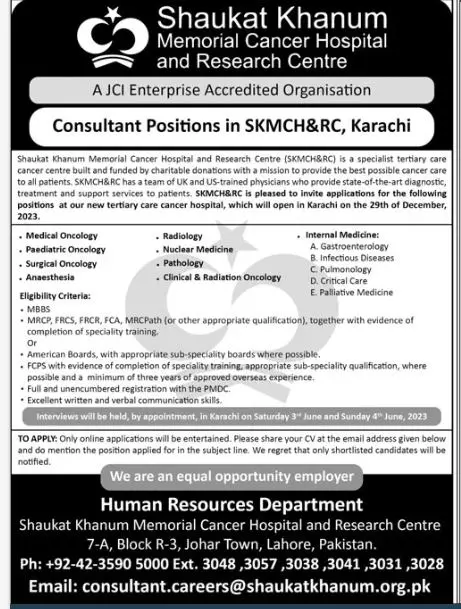Shaukat Khanum Cancer Hospital SKMCH Jobs 2023 announce the Contract career opportunities for the post of See Below Ad in Punjab, Lahore for the fresh and experienced candidates on Contract basis who have Check Advertisement degree. Posted date of this post is 14/05/2023 and the last date is 04/06/2023. if you are eligible for this job apply before due date.