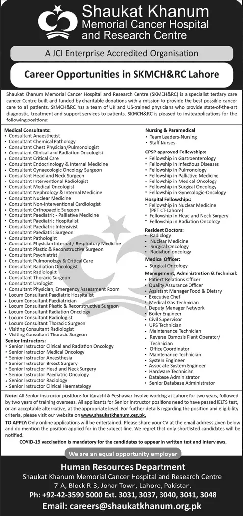Shaukat Khanum Memorial Cancer Hospital Jobs 2022 announce the Contract career opportunities for the post of See Below Ad in Punjab, Lahore for the fresh and experienced candidates on Contract basis who have Check Advertisement degree. Posted date of this post is 04/12/2022 and the last date is 19/12/2022. if you are eligible for this job apply before due date.