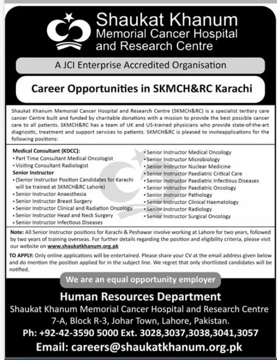 Shaukat Khanum Memorial Cancer Hospital Jobs 2023 announce the Contract career opportunities for the post of See Below Ad in Punjab, Lahore for the fresh and experienced candidates on Contract basis who have Check Advertisement degree. Posted date of this post is 05/11/2023 and the last date is 20/11/2023. if you are eligible for this job apply before due date.