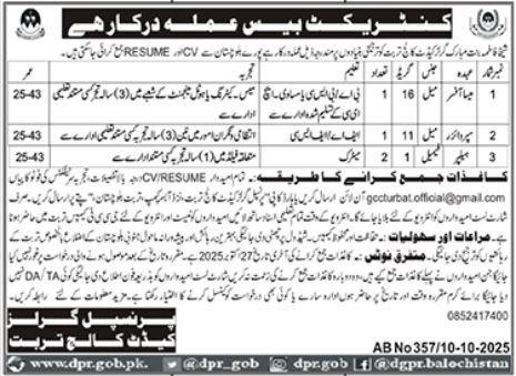 All candidates should send their CV/RESUME along with copies of educational certificates, experience letters, and a photocopy of their CNIC online to gocturbat.official@gmail.com or by post to Principal Girls Cadet College Turbat, Makran. Only shortlisted candidates will be called for an interview. At the time of the interview, all educational documents must be brought along. Candidates must be present for the physical and interview tests at the Cadet College Turbat.