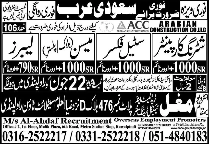 Shuttering Carpenter And Labor Jobs In Saudi Arabia announce the Contract career opportunities for the post of See Below Ad in Saudi Arabia for the fresh and experienced candidates on Contract basis who have Check Advertisement degree. Posted date of this post is 18/06/2023 and the last date is 22/06/2023. if you are eligible for this job apply before due date.