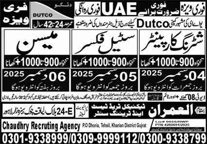 Shuttering Carpenter And Mason Jobs In UAE announce the Contract career opportunities for the post of See Below Ad in United Arab Emirates for the fresh and experienced candidates on Contract basis who have Check Advertisement degree. Posted date of this post is 30/11/2025 and the last date is 06/12/2025. if you are eligible for this job apply before due date.