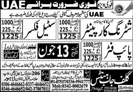 Shuttering Carpenter And Pipe Fitter Jobs In UAE 2023 announce the Contract career opportunities for the post of See Below Ad in United Arab Emirates for the fresh and experienced candidates on Contract basis who have Check Advertisement degree. Posted date of this post is 12/06/2023 and the last date is 13/06/2023. if you are eligible for this job apply before due date.