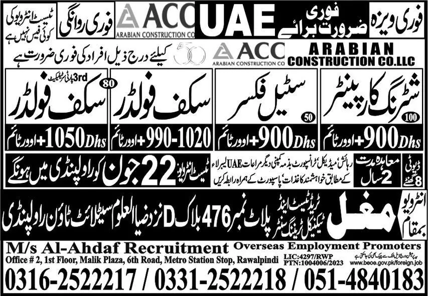 Shuttering Carpenter And Scaffolder Jobs In UAE announce the Contract career opportunities for the post of See Below Ad in United Arab Emirates for the fresh and experienced candidates on Contract basis who have Check Advertisement degree. Posted date of this post is 18/06/2023 and the last date is 22/06/2023. if you are eligible for this job apply before due date.