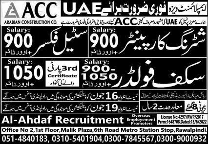 Shuttering Carpenter And Scaffolder Jobs In UAE 2023 announce the Contract career opportunities for the post of See Below Ad in United Arab Emirates for the fresh and experienced candidates on Contract basis who have Check Advertisement degree. Posted date of this post is 15/06/2023 and the last date is 19/06/2023. if you are eligible for this job apply before due date.