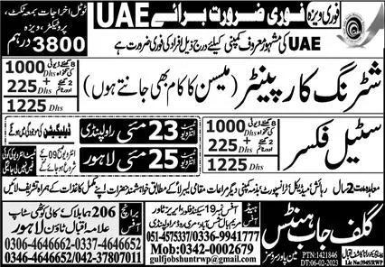 Shuttering Carpenter And Steel Fixer Jobs In UAE announce the Contract career opportunities for the post of See Below Ad in United Arab Emirates for the fresh and experienced candidates on Contract basis who have Check Advertisement degree. Posted date of this post is 21/05/2023 and the last date is 25/05/2023. if you are eligible for this job apply before due date.