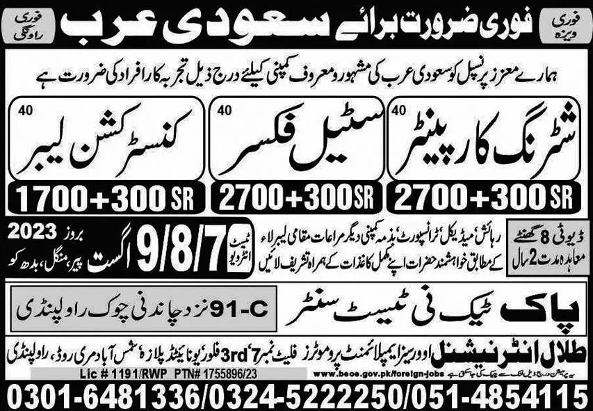 Shuttering Carpenter & Construction Labor Jobs 2023 announce the Contract career opportunities for the post of See Below Ad in Saudi Arabia for the fresh and experienced candidates on Contract basis who have Check Advertisement degree. Posted date of this post is 05/08/2023 and the last date is 09/08/2023. if you are eligible for this job apply before due date.