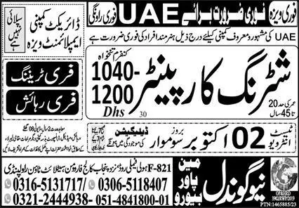 Shuttering Carpenter Jobs 2023 In UAE announce the Contract career opportunities for the post of See Below Ad in United Arab Emirates for the fresh and experienced candidates on Contract basis who have Check Advertisement degree. Posted date of this post is 01/10/2023 and the last date is 02/10/2023. if you are eligible for this job apply before due date.
