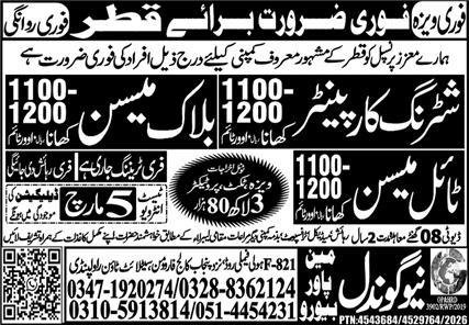 Shuttring Carpanter And Tile Mason Jobs in Qatar 2026 announce the Contract career opportunities for the post of See Below Ad in Qatar for the fresh and experienced candidates on Contract basis who have Check Advertisement degree. Posted date of this post is 02/03/2026 and the last date is 05/03/2026. if you are eligible for this job apply before due date.