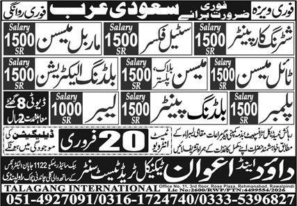 Shuttring Carpanter And Tile Mason Jobs in Saudia Arabia announce the Contract career opportunities for the post of See Below Ad in Saudi Arabia for the fresh and experienced candidates on Contract basis who have Check Advertisement degree. Posted date of this post is 15/02/2026 and the last date is 20/02/2026. if you are eligible for this job apply before due date.