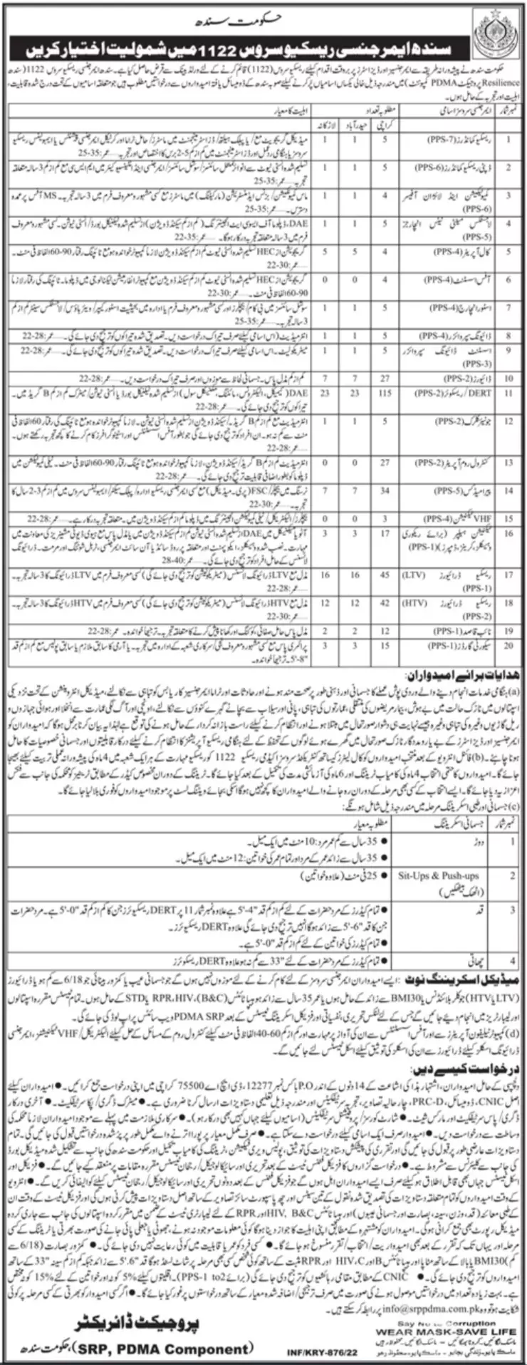 Sindh Emergency Rescue Service 1122 Jobs 2022 announce the Permanent career opportunities for the post of See Below Ad in Sindh for the fresh and experienced candidates on Permanent basis who have Check Advertisement degree. Posted date of this post is 01/03/2022 and the last date is 15/03/2022. if you are eligible for this job apply before due date.