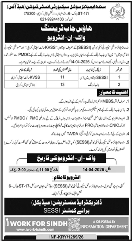 Sindh Employees Social Security Institution Karachi Job 2026 announce the Contract career opportunities for the post of See Below Ad in Sindh, Karachi for the fresh and experienced candidates on Contract basis who have Check Advertisement degree. Posted date of this post is 02/04/2026 and the last date is 14/04/2026. if you are eligible for this job apply before due date.