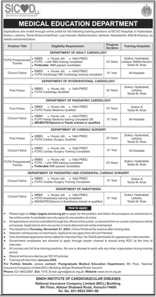 Sindh Institute Of Cardiovascular Diseases Karachi Jobs 2025 announce the Contract career opportunities for the post of See Below Ad in Sindh, Karachi for the fresh and experienced candidates on Contract basis who have Check Advertisement degree. Posted date of this post is 12/11/2025 and the last date is 27/11/2025. if you are eligible for this job apply before due date.