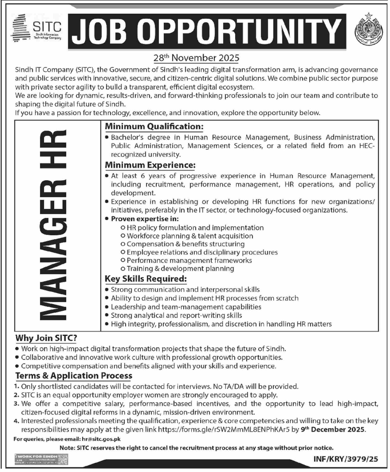 Sindh It Company Sitc Sindh Karachi Jobs 2025 announce the Contract career opportunities for the post of See Below Ad in Sindh, Karachi for the fresh and experienced candidates on Contract basis who have Check Advertisement degree. Posted date of this post is 28/11/2025 and the last date is 09/12/2025. if you are eligible for this job apply before due date.