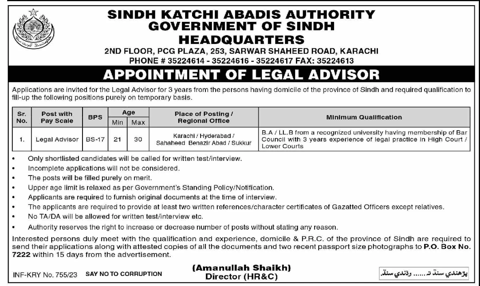 Apply at Sindh Katchi Abadi Authority latest Government jobs in Legal and departments before closing date which is around March 17, 2023 or as per closing date in newspaper ad.