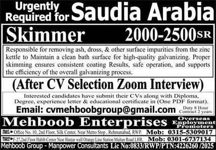 Skimmer Jobs Open In Saudi Arabia 2025 announce the Contract career opportunities for the post of See Below Ad in Saudi Arabia for the fresh and experienced candidates on Contract basis who have Check Advertisement degree. Posted date of this post is 12/11/2025 and the last date is 18/11/2025. if you are eligible for this job apply before due date.