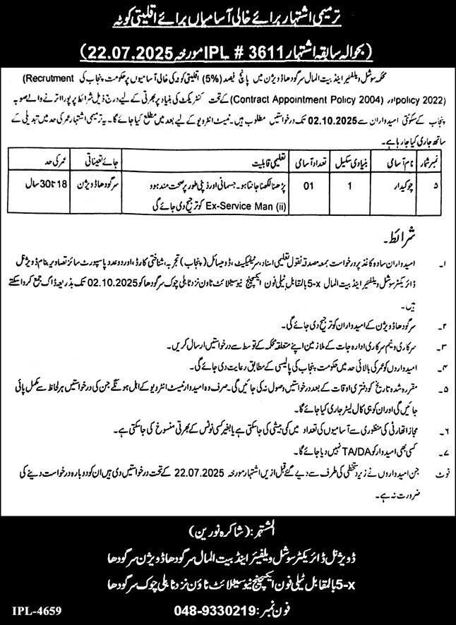 Applications are invited from domicile holders of Punjab who fulfill the following conditions for recruitment on a contract basis under the Government of Punjab's Recruitment Policy 2022 and Contract Appointment Policy 2004 for 5% minority quota vacant posts in the Social Welfare and Bait-ul-Maal Department, Sargodha Division, by 02.10.2025. The interview schedule will be communicated later. This amended advertisement is being issued with a change in the age limit.