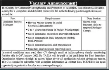 Society for Community Strengthening and Promotion of Jobs announce the Contract career opportunities for the post of See Below Ad in Balochistan, Quetta for the fresh and experienced candidates on Contract basis who have Check Advertisement degree. Posted date of this post is 16/01/2023 and the last date is 20/01/2023. if you are eligible for this job apply before due date.