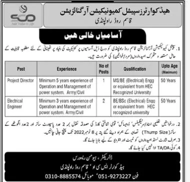 Special Communication Organization SCO Jobs 2022 announce the Contract career opportunities for the post of See Below Ad in Punjab, Rawalpindi for the fresh and experienced candidates on Contract basis who have Check Advertisement degree. Posted date of this post is 26/10/2022 and the last date is 08/11/2022. if you are eligible for this job apply before due date.