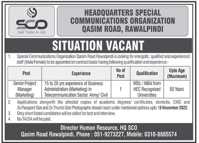- Applications are invited from suitable and qualified individuals for Special Communication Organization SCO Qasim Road Rawalpindi Jobs 2022. We get this advertisement from the Daily Express newspaper.