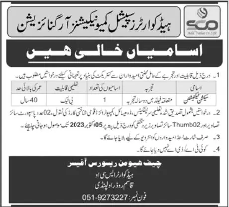 Special Communication Organization SCO Jobs 2023 announce the Contract career opportunities for the post of See Below Ad in Punjab, Rawalpindi for the fresh and experienced candidates on Contract basis who have Check Advertisement degree. Posted date of this post is 27/09/2023 and the last date is 05/10/2023. if you are eligible for this job apply before due date.