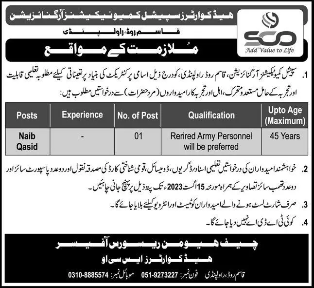 Special Communications Organization SCO Rawalpindi Jobs 2023 announce the Contract career opportunities for the post of See Below Ad in Punjab, Rawalpindi for the fresh and experienced candidates on Contract basis who have Check Advertisement degree. Posted date of this post is 02/08/2023 and the last date is 15/08/2023. if you are eligible for this job apply before due date.
