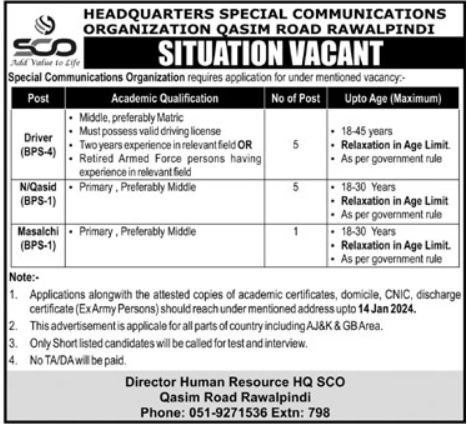 Special Communications Organization SCO Rawalpindi Jobs 2024 announce the Contract career opportunities for the post of see b in Punjab, Rawalpindi for the fresh and experienced candidates on Contract basis who have Check Advertisement degree. Posted date of this post is 30/12/2023 and the last date is 14/01/2024. if you are eligible for this job apply before due date.