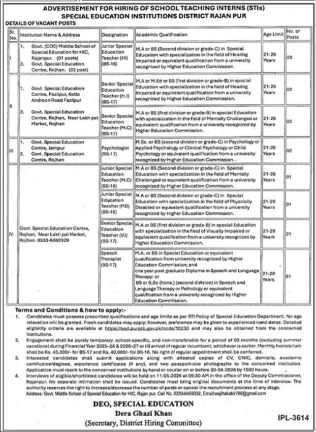 Special Education Institution Dera Ghazi Khan Jobs 2026 announce the Contract career opportunities for the post of See Below Ad in Punjab, Dera Ghazi Khan for the fresh and experienced candidates on Contract basis who have Check Advertisement degree. Posted date of this post is 16/04/2026 and the last date is 30/04/2026. if you are eligible for this job apply before due date.