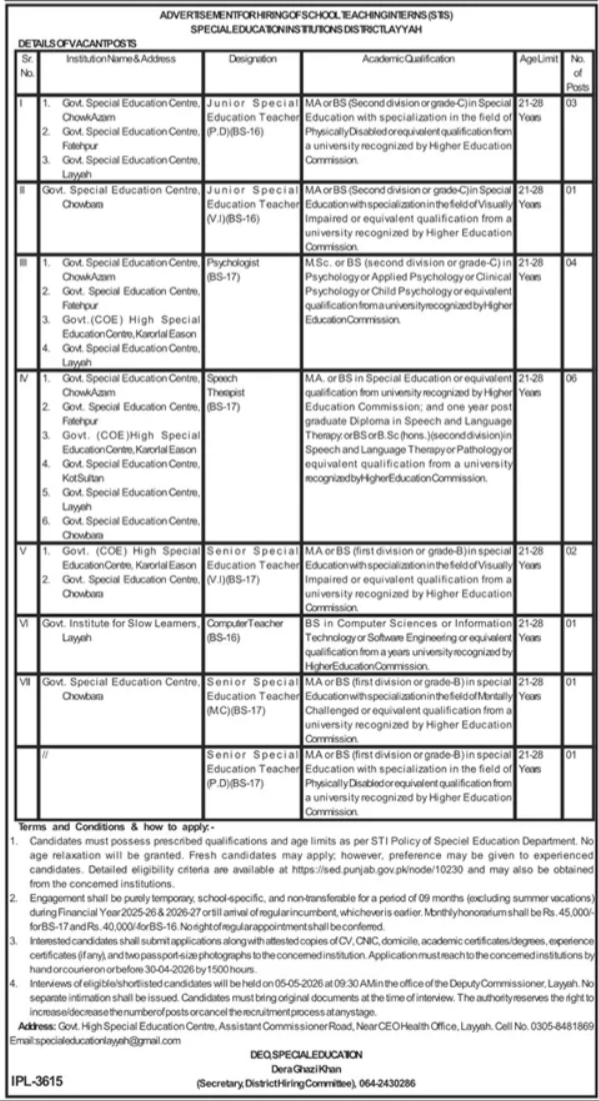 Special Education Institution SEI Layyah Jobs 2026 announce the Contract career opportunities for the post of See Below Ad in Punjab, Layyah for the fresh and experienced candidates on Contract basis who have Check Advertisement degree. Posted date of this post is 16/04/2026 and the last date is 30/04/2026. if you are eligible for this job apply before due date.