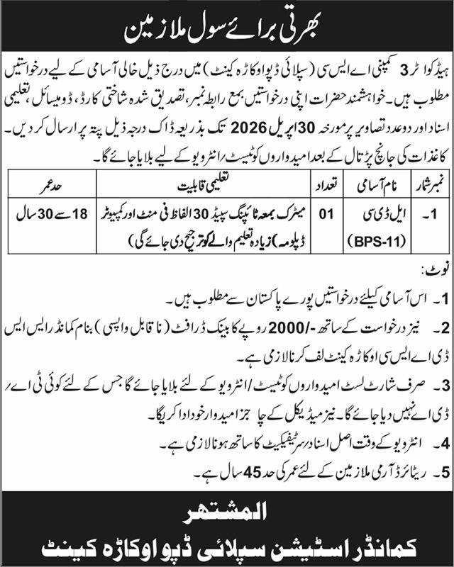 Station Supply Depot Okara Cantt Job 2026 announce the Contract career opportunities for the post of See Below Ad in Punjab, Okara for the fresh and experienced candidates on Contract basis who have Check Advertisement degree. Posted date of this post is 06/04/2026 and the last date is 30/04/2026. if you are eligible for this job apply before due date.