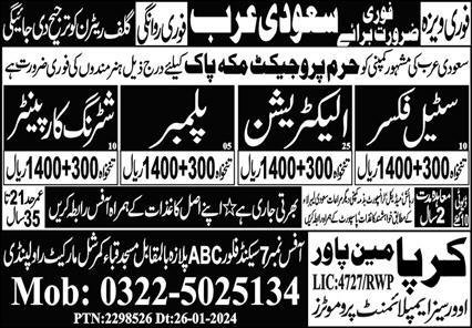 Steel Fixer And Electrician Jobs 2024 In Saudi Arabia announce the Contract career opportunities for the post of See Below Ad in Saudi Arabia for the fresh and experienced candidates on Contract basis who have Check Advertisement degree. Posted date of this post is 04/02/2024 and the last date is 02/03/2024. if you are eligible for this job apply before due date.