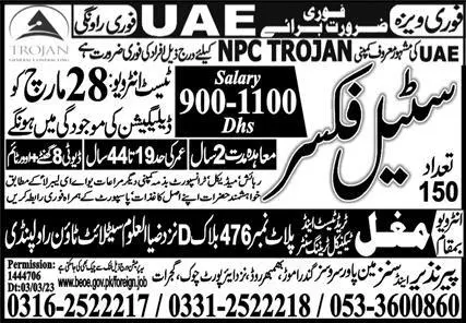 Steel Fixer for UAE Jobs 2023 announce the Contract career opportunities for the post of See Below Ad in United Arab Emirates for the fresh and experienced candidates on Contract basis who have Check Advertisement degree. Posted date of this post is 26/03/2023 and the last date is 28/03/2023. if you are eligible for this job apply before due date.