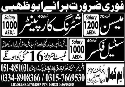 Steel Fixer & Shuttering Carpenter Jobs 2023 In UAE announce the Contract career opportunities for the post of See Below Ad in United Arab Emirates for the fresh and experienced candidates on Contract basis who have Check Advertisement degree. Posted date of this post is 12/05/2023 and the last date is 19/05/2023. if you are eligible for this job apply before due date.