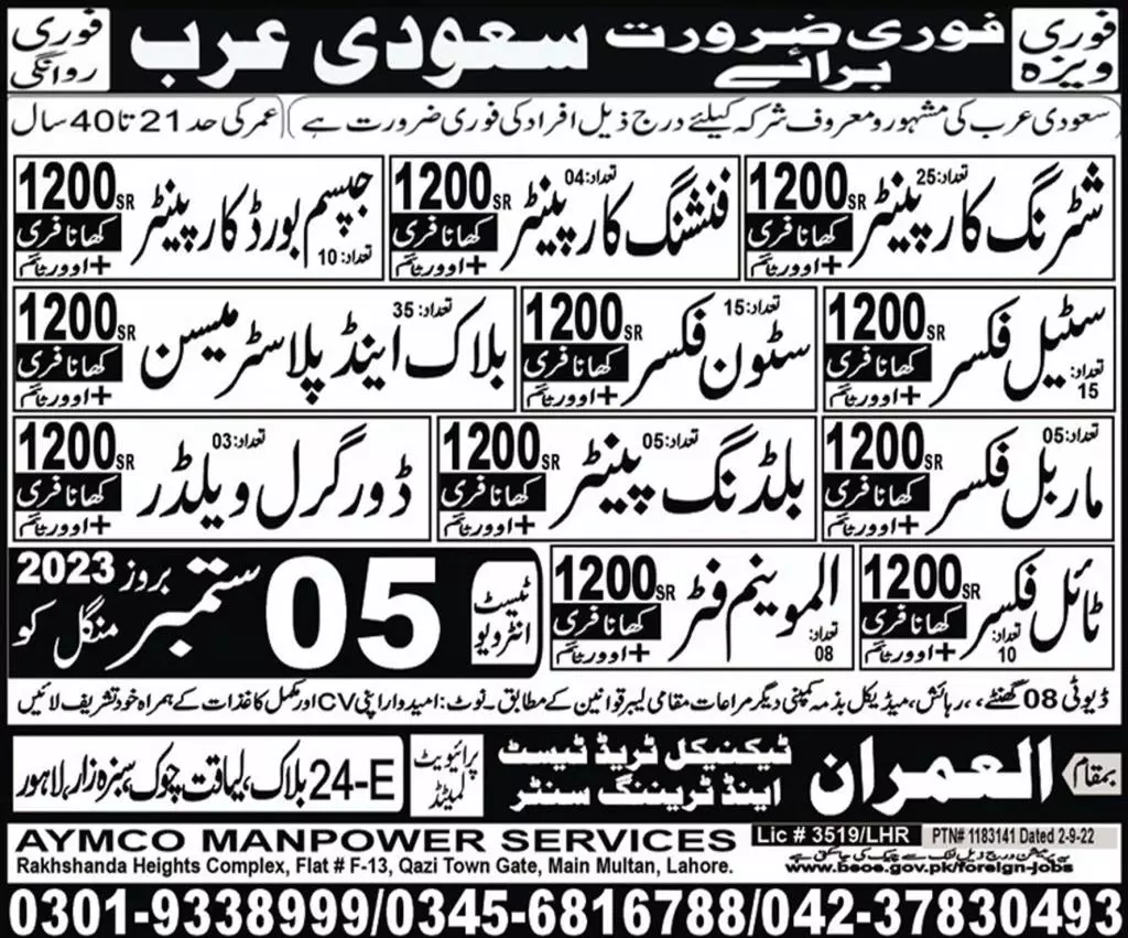 Stone Fixer & Marble Fixer Jobs 2023 In Saudi Arabia announce the Contract career opportunities for the post of See Below Ad in Saudi Arabia for the fresh and experienced candidates on Contract basis who have Check Advertisement degree. Posted date of this post is 02/09/2023 and the last date is 05/09/2023. if you are eligible for this job apply before due date.